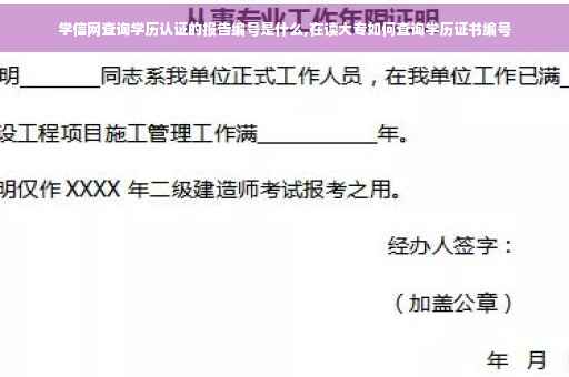 报告编号,顾名思义就是学历认证报告上的报告编号,一般是七位数字,这个报告编号是在您对您的学历进行了学历认证申请后,认证通过后打印学历认证纸质报告上附带的,直接用报告上的报告编号+毕业证编号一起在学信网-学历认证频道即可查询学历认证报告的电子档, 学历认证报告是教育部学信网为了打击社会上学历造假所推出的一项有偿服务。 在我国很多省会城市都设有现场受理点。办理时间为20-30个工作日,也就是1-1个半月。 目前鉴证网为了方便不在省会的朋友,节省大家的认证费用所推出的网上认证服务。 只需要登录网站,注册账号,按照要求上传毕业证、身份证原件扫描件,在家就可以完成认证申请。VIP认证的话3-7个工作日就可以出结果。 并且推出快递邮寄服务。