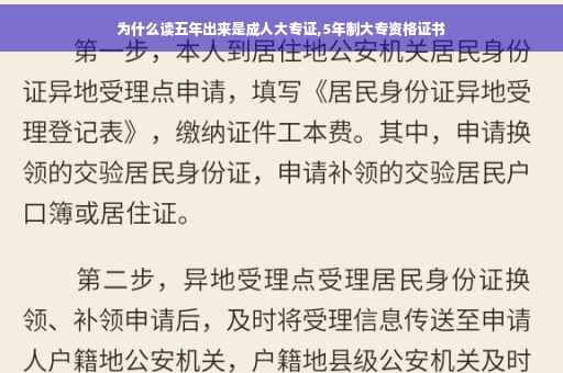 读五年出来成为成人大专证是因为这个学习时间通常比传统的大专学习时间长。在某些教育制度中,一般的大专课程需要三年时间完成,而读五年则提供了更多的学习机会和课程选择。