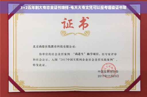 3+2五年制大专毕业证上会在专业后面清晰的标识出3+2字样,或者五年一贯制字样,以示与普通大专毕业证的区别。这里的3+2分为两种,一种是中高职三二分段制,毕业后获得的是专科学历;另外一种是专科学生在专科院校读到大三,之后参加省级统考,被本科院校录取后获得的是本科学历。