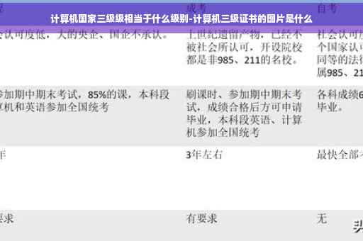 相当于计算机系本科三年级。计算机三级就是教育部根据计算机水平对计算机等级考试的一个级别的划分啊。计算机等级考试分1~4级。计算机三级包括三级网络技术,三级pc技术。三级信息管理技术和三级数据库技术。考试的话分笔试跟上机,代表了持证人一定的计算机等级水平。