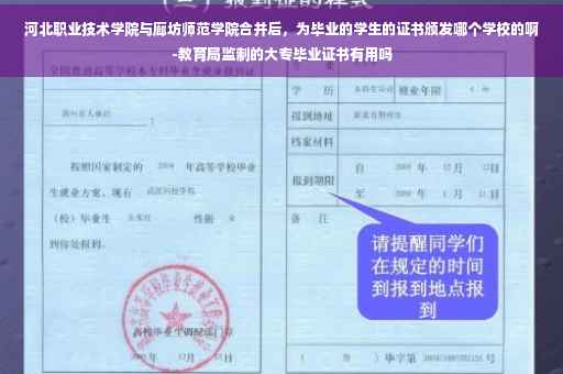 合并后尽管毕业证是由廊坊师范学院来颁发,但毕业证书仍然注明毕业于河北职业技术学院,落款也是河北职业技术学院,直到原河北职业技术学院的学生完全毕业为止,颁发的证书和合并之前没有区别,仍然是大专毕业证。河北职业技术学院的毕业证国家当然承认,就像师院以前是由廊坊师专,廊坊教育学院,廊坊师范学校合并的一样,所有的毕业生现在都可以说是廊坊师范学院毕业的。