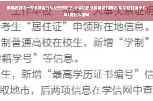 一、英语教育这一专业所需的从业资格如下: 1、普通话二级乙等证书; 2、计算机等级证书; 3、全国英语等级考试PETS-3级证书; 4、小学教师资格证书; 二、英语教育就业方向如下: 适合在中小学、幼儿园教学以及其他类型、层次的英语培训机构从事英语教学工作和教育管理工作;其次在各类各级公司、企业从事一般性翻译或外贸工作。