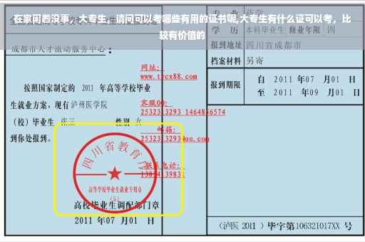 大专生可以考的有价值的证很多,学历只代表过去,学习的能力即学力和劲头才是主要的,推荐你如果有空可以考一考中级经济师证、软考高项证等证书,一者这几个证书报名限制较少,对学历要求少,对工作年限也不做多要求,尤其是高项证报考啥条件都木有,小学文化都可以报;二者这几个证书的考试内容较少,如经济师考试内容是两本书,一本专业课一本基础课,认真看书俩月必搞定。高项证就一本书,翻来覆去看几遍三个月差不多就冲过去了,轻松!三者这几个证拿到手就是走遍天下都不怕,为啥?因为这是国家部委颁发的,全国通用的,经济师证在单位可应聘中级职称,高项证可应聘副高级职称,不用劳心费神评审即可。