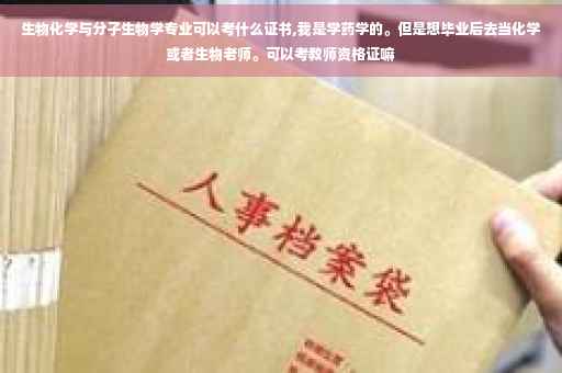 生物化学与分子生物学专业可以考证书有。执业药师证书,全国执业药师资格考试有中华人民共和国人力资源和社会保障部,国家食品药品监督管理总局。共同负责职业。药师资格考试工作。营养师证书,营养师是指通过严格营养基础理论学习和专业临床营养技能修练。