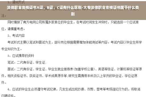 2、B类和C类的法律职业资格证是为了保证该地区法律职业人才的需求和补充,是立法允许在这些地区放宽报名学历条件。而A类要求很严格,必须为大学本科及以上的学历。