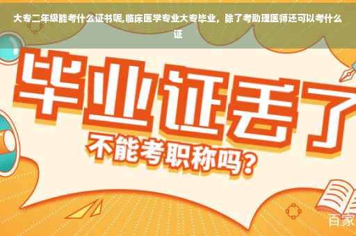 临床医学专业大专毕业,一般都是考助理医师证,然后做相关的工作后在考医师资格证; 据《中华人民共和国执业医师法》及有关规定具有下列条件之一的,可以参加医师资格考试: (一)具有高等学校医学专业本科以上学历,在执业医师指导下,在医疗、预防、保健机构中试用期满一年的; (二)取得执业助理医师执业证书后,具有高等学校医学专科学历,在医疗、预防、保健机构中工作满二年;具有中等专业学校医学专业学历,在医疗、预防、保健机构中工作满五年的。 (三)具有高等学校医学专科学历或者中等专业学校医学专业学历,在执业医师指导下,在医疗、预防、保健机构中试用期满一年的,可以参加执业助理医师资格考试。 以师承方式学习传统医学满三年或者经多年实践医术确有专长的,经县级以上人民政府卫生行政部门确定的传统医学专业组织或者医疗、预防、保健机构考核合格并推荐,可以参加执业医师资格或者执业助理医师资格考试。考试的内容和办法由国务院卫生行政部门另行制定。