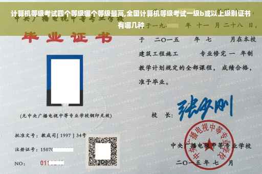全国计算机等级考试一级b或以上级别证书有二级vb、二级c语言、二级C++、二级Java、二级WEB程序设计、二级VFP、三级PC技术、三级信息管理技术、三级数据库技术、三级网络技术等。 全国计算机等级考试(NationalComputerRankExamination,以下简称NCRE),是经原国家教育委员会(现教育部)批准,由教育部考试中心主办,面向社会,用于考查非计算机专业应试人员计算机应用知识与技能的全国性计算机水平考试体系。
