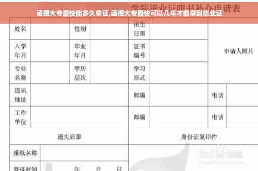 函授大专最快2.5年可以拿毕业证,成考函授招生层次分高中起点升本科(简称高起本)、高中起点升专科(简称高起专),获取毕业证书与同等学历普通高等教育统招文凭享受同样的待遇。