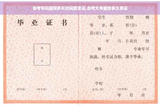 两年。自考大专最快需要2.5-3年的时间才能拿到毕业证,因为自考执行的是单科结业制,合格一门发一门的合格证书,而自考的考试科目是比较多的,一般在12-16门左右,所以最快也是需要两年半的时间。
