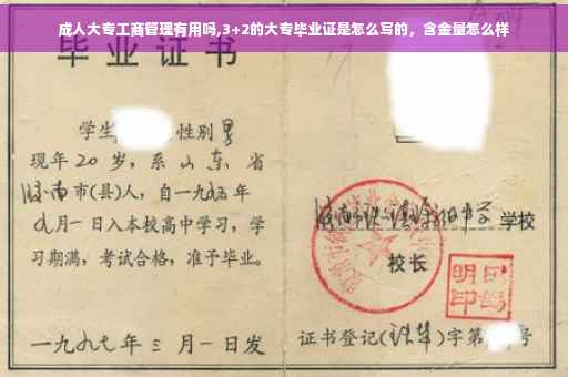 3+2的大专毕业证是成人高考大专毕业证,含金量不如全日制。