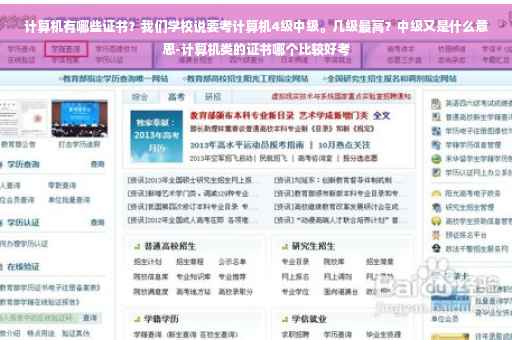 1。计算机等级考试,教育部旗下的考试,分1-4级。最高级是4级,对应的是计算机专业本科毕业的水平。考试分理论考试(笔试)和上机考试两部分,一般而言,笔试的应试准备比上机要轻松一点,上机考试有时还会受当时的情绪影响(紧张)。