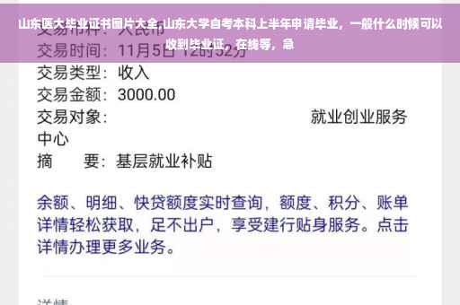 考生可通过山东大学教务管理系统查询到证书。山东大学自考毕业申请流程一:自学考试的毕业申请时间上半年为6月15~20日,下半年为12月15~20日。申请上半年毕业的考生,必须在5月1日前办理合并准考证号、转考、免考、考籍数据更正手续;申请下半年毕业的考生,必须在11月1日前办理合并准考证号、转考、免考、考籍数据更正手续。逾期办理者,不能申请本次毕业。山东大学自考毕业申请流程二:办理本科毕业申请的考生,请提前办理前学历的学历鉴定,以便在申请毕业时同时提交。申请上半年本科毕业的应届专科毕业生,可延迟至8月5日前提交学历鉴定。按规定可延迟提交学历鉴定的,由考生自行复印鉴定证明,并在复印件上注明准考证号、所属地市、毕业专业等信息,将复印件寄往省考办。山东大学自考本科上半年申请毕业,一般8月下旬领证,下半年申请毕业第二年2月下旬领证,具体领证时间由自考办通知。 考生可通过山东大学教务管理系统查询到证书。