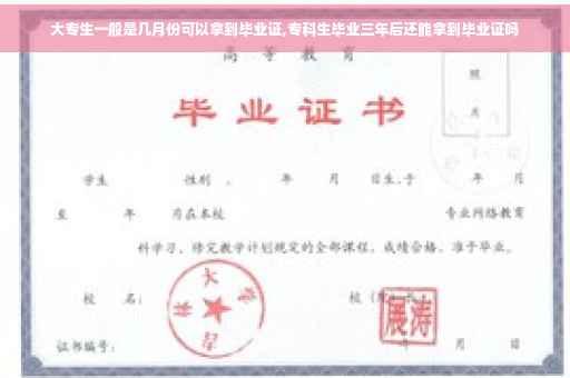 回答。大专生一般是大三的六月底可以拿到毕业证。按照教育部的规定。大专生一般在大二就学习完课本上的理论知识。然后大三。参加学校组织的实习。在五月底的时候写实习报告。然后返回学校参加学校的毕业设计和论文答辩。这些都合格了。学校才会发给你毕业证。
