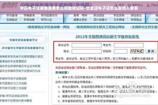 有两种办法,可以注册学信网的学信档案,查看学历信息,然后在学历信息里点申请,可以获取到12位的在线验证码,也可以直接在学信网的学历查询--零散查询里,花费2元短信手机获取查询码后查询你的毕业证信息,然后在查询结果页面点“在线申请”,获取电子注册备案的12位的验证码,希望可以帮上你