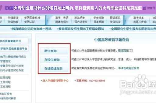 从2005年以后的大专毕业证都可以在网上直接查询,05年之前毕业的,如果网上查不到,可以让学生出具新生入学时的:注册表复印件(复印件上应显示出有“省级招生部门的学籍注册专用章”,学校再加盖公章)和学校证明(加盖公章,学校出具证明时,应注明学校主管学籍的部门的办公电话和联系人)。