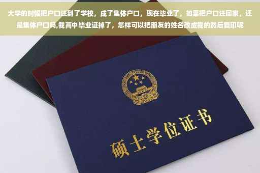 大学毕业后,将户口迁回原籍就不再是集体户口了。 大学毕业户口迁回原籍的步骤和所需材料如下: 第一步:持原籍户口本、现户口本(集体户口一般不打印户口本,即使打印也只打印户成员页)、身份证、毕业证、派遣证,到现户籍所在地派出所户籍室办理迁移证。一般情况下,由学校统一办理。 第二步:持原籍户口本、身份证、毕业证、派遣证和迁移证,到原籍派出所户籍室办理迁移手续,打印户口本,重新办理身份证(户口迁出后未办理身份证,身份证上地址与原籍地址一致的,不需要重新办理)。高中毕业证掉了,最好不要把朋友的姓名改成自己的, 高中毕业证书由省教育厅统一管理,省、市两级教育主管部门审查、验印,毕业证书一律于毕业当年颁发,不予补发。但教育局可以办理基础教育学校毕业证书遗失证明,具体程序如下:(1)本人到原毕业学校查核毕业证书存根或出具证明;(2)本人登报声明原证遗失作废;(3)本人持证明、报纸、照片等材料到市教育局基础教育科申报;(4)教育局核发遗失证明。 如果只是出国留学需要,到学校开具高中毕业证明及高中三年学习成绩后,再到公证处做个公证也就可以了。
