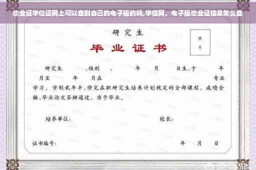 可以在网上查到自己的毕业证和学位证电子版。 具体查询方法如下: 1、在搜索引擎中搜索“学历查询” 2、击进入“中国高等教育学生学信网” 3、在网页中间“学信档案”进入个人注册(个人注册后的查询是免费的 )
