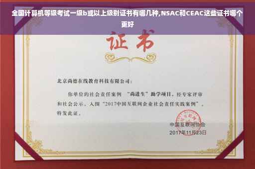 全国计算机等级考试一级b或以上级别证书有二级vb、二级c语言、二级C++、二级Java、二级WEB程序设计、二级VFP、三级PC技术、三级信息管理技术、三级数据库技术、三级网络技术等。 全国计算机等级考试(NationalComputerRankExamination,以下简称NCRE),是经原国家教育委员会(现教育部)批准,由教育部考试中心主办,面向社会,用于考查非计算机专业应试人员计算机应用知识与技能的全国性计算机水平考试体系。