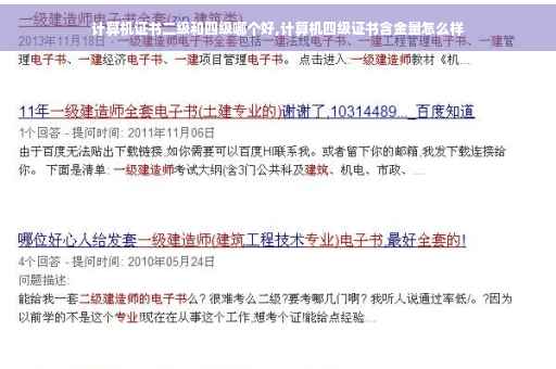 过了四级,但如果单靠那个四级证,你也找不到好工作,老实说,四级的地位很尴尬——食之无味弃之可惜,对于非计算机专业的人员来说,计算机等级考试的证书可以增加他们的就业竞争力,但是4级对于他们来说用不上——过于专业化了,2、3级足够满足他们的要求;而对于计算机专业的人员来说,四级不够用——四级的内容仅相当于计算机自考本科关于计算机方面的内容,当今社会还没听说过仅凭着自考本科毕业证就能找到很好的工作的,在校的全日制本科生学的东西要比四级多不少。 四级的主要作用不在于给别人看,而是在于给你自己一个学习的指路牌,积累知识用的。要记住NCRE当初设立的目的就是全民普及电脑知识用的。对于喜欢计算机但是未能考取计算机专业的同学,对于没能考上大学但是希望学习计算机的同学,对于学习计算机专业想检验一下自己的知识是否够基本标准线的同学,四级都是一个很好的选择。四级的内容涉及了计算机专业本科的经典主干核心课程,学了它以后,再学习一点实用的技术如单片机编程、asp、jsp、j2ee等,再自己开发出一个中小型的软件或者网站。并向用人单位展示你的作品,你会得到一个惊喜。 记住,四级只是阶梯,只是过程,而不是终点和最终目标