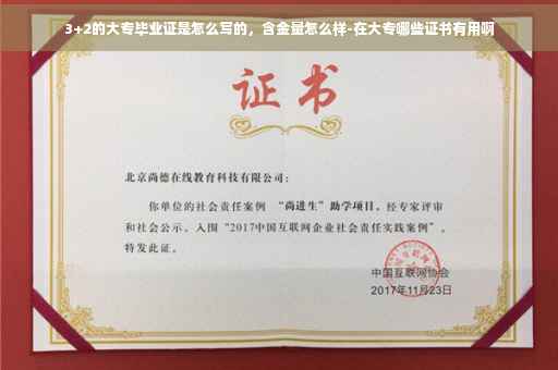 3+2大专是中专学校开设的一种班,就是初中毕业生在中专报名读五年书就可以直接拿大专毕业证了,其实是成人高考大专毕业证,只有通过对口高职进入的大专才是全日制,所以3+2的大专毕业证是成人高考大专毕业证,含金量不如全日制。