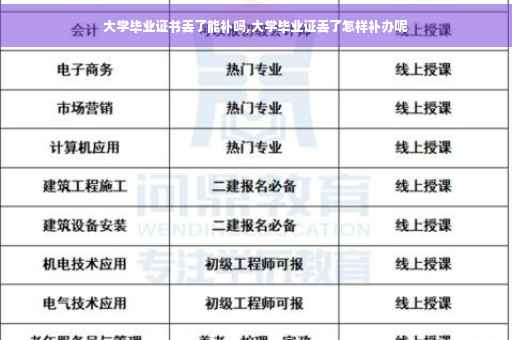 教育部明文规定,大学毕业证和学位证遗失后不能补办。丢失毕业证或学位证后,只可以凭借相关材料交由学校审核,并开具相应的毕业证明书或者学历学位证明。