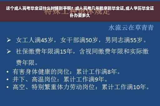 成人高考毕业证的到手时间取决于报考的学校和地区的办理速度,一般需要在考试后的2-3个月内领取。至于成人高考拿到毕业证的时间,通常需要根据个人的学业进展来确定。