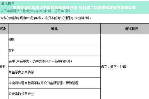 河南考区肯定是这样的,别的省区的话,估计也差不多少。考试教材以教育部考试中心明确的为准,教育部考试中心网址: http://www.neea.edu.cn。请考生按规定时间到考点履行报名手续;根据报名点通知的时间和地点领取准考证(网报的考生按考点要求在规定时间内自己打印准考证)、按时在原报名考点参加考试。考生在考试结束45天后,可凭身份证到原报名考点查看成绩和领取证书。各等级合格证书由教育部考试中心统一印制,省招办转发给各考点;选择邮寄方式的考生合格证书由考试中心统一负责邮寄。没有计算机等级证书可以拿到毕业证书,但是不一定能领学士学位证书。
