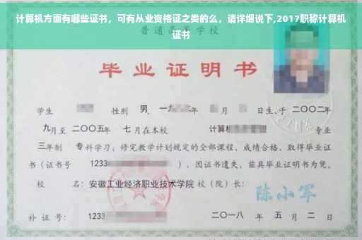 计算机在中国目前有三种从业资格证书,一类是操作证书,由劳动部门颁发,可通过各种社会培训机构参训后报名参加考试,如一级、二级和普通操作证书;二类是专业技术证书,由工信部组织考试,各省颁发证书,直接网上报名参加考试,分初级、中级、高级,如程序员、系统分析师、信息系统项目管理师、构架师等证书;三类是由专业信息公司组织专门的实用技术考试,颁发专业从业资格证书,如西门子交换机维护工程师、ORACLE数据库维护工程师、华为路由器售后服务工程师等证书。