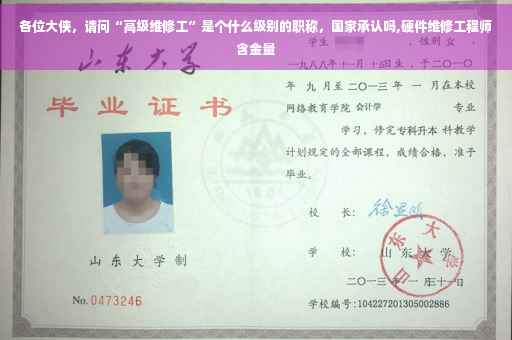 这个不属于职称 是职业技能等级证书,有计算机维修工 制冷设备维修工 汽车维修工等,国家分别制订了相应的考核标准,初级(五级)、中级(四级)、高级(三级)、技师(二级)、高级技师(二级),你说的高级维修工就是这个三级。一般现在找工作的话,最低要求都是中级、高级了。对具备这类技能证书的技工人员有相应的补贴标准、