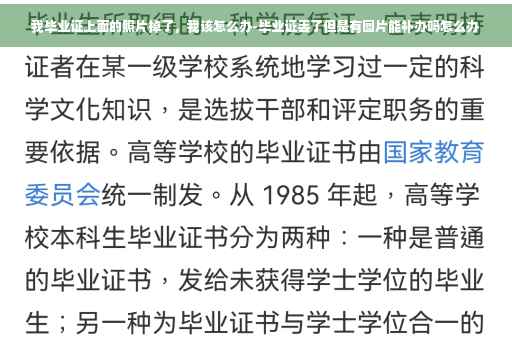毕业证上的照片丢了就相当于毕业证丢失,要证明学历的话,可以申请补办毕业证明书或者下载电子学历认证报告,不能补办毕业证。