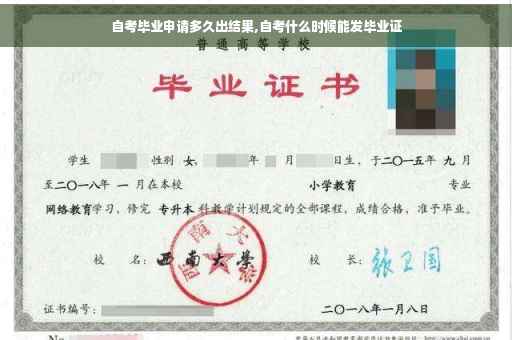 申请自考毕业的考生,通常情况下,毕业申请完两个月左右,可到所在地自考办领取毕业证书及毕业生登记表。具体时间及方式以当地自考办公布的要求为准。自考毕业证书可在中国高等教育学生信息网上查询,一般是毕业证书上打印的毕业日期的半年后能查询到信息。
