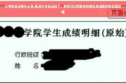 高中毕业证掉了,最好不要把朋友的姓名改成自己的, 高中毕业证书由省教育厅统一管理,省、市两级教育主管部门审查、验印,毕业证书一律于毕业当年颁发,不予补发。但教育局可以办理基础教育学校毕业证书遗失证明,具体程序如下:(1)本人到原毕业学校查核毕业证书存根或出具证明;(2)本人登报声明原证遗失作废;(3)本人持证明、报纸、照片等材料到市教育局基础教育科申报;(4)教育局核发遗失证明。 如果只是出国留学需要,到学校开具高中毕业证明及高中三年学习成绩后,再到公证处做个公证也就可以了。