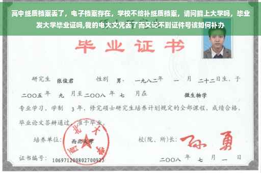 毕业证丢失是不能补办的,可以致电原来就读学校的学生工作办公室,可以要求办理办理毕业证明,可以当作毕业证使用,但是有些机构不会很相信,可以拿毕业证明去公正机关公正一下,如果不想这么麻烦的话可以找网上的办正公司办理,资料可以在学信网上查询到,弄到照片、毕业证编号以及其他资料,可以办理出一张一模一样的出来的,和真的一样使用而不必有心理负担的。