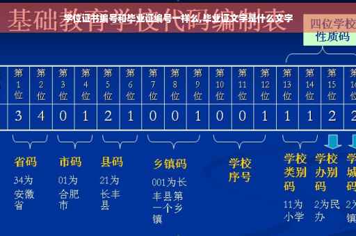 学历证书编号和学位证书编号不一样。 现在的毕业证和学位证后面几位数字都是电脑随机产生的编码,毕业证是毕业证编码,学位证是学位证编码,二者肯定不一样的,后面的顺序也没有什么规律可循。 学历证书是学制系统内实施学历教育的学校或者其他教育机构,对完成了学制系统内一定教育阶段的学习任务的受教育者所颁发的文凭。