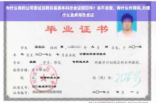 申请高新技术企业的公司,需要中高级人才达到一定的比例,员工毕业证即是证明资料之一。当你知道自己已经获得了这个职位,公司需要将你的本科毕业证复印件作为档案留底。