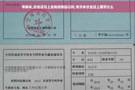专转本毕业证书上会标明是专转本毕业的。跟普通全日制毕业的是不一样的。普通全日制毕业的话,是没有标明专转本的。如果是专转本毕业,毕业证书上会特意的标明你是专转本毕业。跟普通的本科生毕业还是有很大的区别的。包括学士学位证上也会标明。