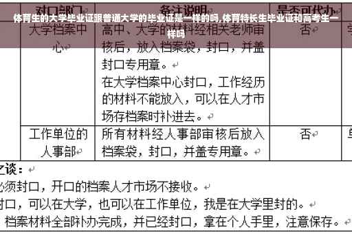 体育特长生和普通高考生在高考录取上是不同的,体育特长生可以通过加试(即在高考前进行的体育测试)和高考成绩综合评定的方式被高校录取,而不必完全依赖高考成绩。其毕业证与普通高考生所获得的毕业证是相同的。需要注意的是,体育特长生要求在中考阶段就进行特长测验,并取得较高的成绩,方能进入体育特长生培训班,并最终成为体育特长生。