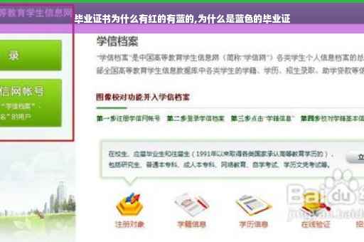 :教育部门为了区别毕业证的种类,才有了蓝色的和红色外皮之分,四年制在校学习毕业为红色(就是参加普通高考正规录取的国家普通高校应届毕业)其余的什么函授、夜大之类毕业的都是蓝色。
