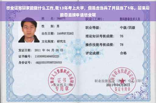 如果你当两年兵就退伍的话,估计会让你从大一开始读起,也可能从大三读起,如果是五年或更久才退伍的话,一般等你同届同学毕业的时候也会给你毕业证的,我那时候是高三没毕业去当兵的,到此,以上就是小编对于毕业证寄回家能做什么的问题就介绍到这了,希望介绍关于毕业证寄回家能做什么的2点解答对大家有用。