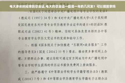 电大毕业后1-4个月可领取毕业证书,拿到毕业证的时间是1月和7月。电大实行的是学分制,学籍自注册入学起八年内有效,考生在规定的学制年限内,修满学分,成绩合格,即可取得电大本科或专科毕业证书,可在中国高等教育学生信息网上查询。