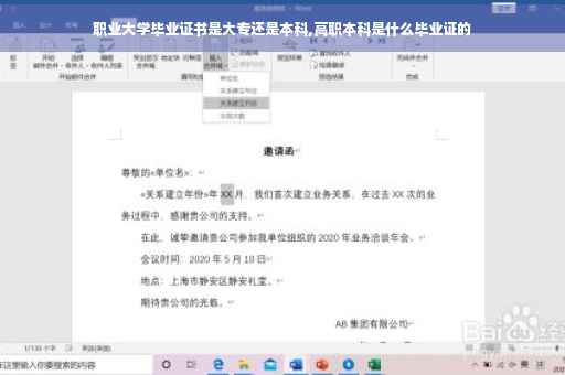 职业大学毕业证书是大专,职业本科一般是指高等职业本科,高等职业本科(简称高职本科)是全日制本科学历教育的一种,学位为专业学士,高职本科与普通本科共同构成中国高等教育体系的全日制本科层次。大专指的是专科,即专科教育,是高等教育的组成部分,是大学学历层次之一,专科教育的基本修业年限为二至三年,非全日制高等学历教育的修业年限应当适当延长。