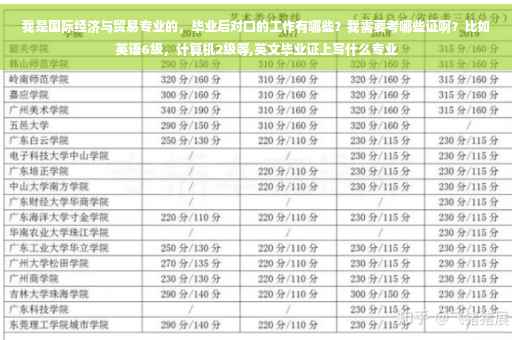 六是从事教学研究。 考证,英语六级、计算机二级是必要的,尤其外语等级分数越高越好。其它专业证书,并不太重要,近年国贸岗位对证书并没有要求,做外贸外销员、跟单员、报关员、外贸会计等证书也可考虑考一下。如果将来打算进入金融机构就业,可考银行从业资格、证券从业资格、基金从业资格。