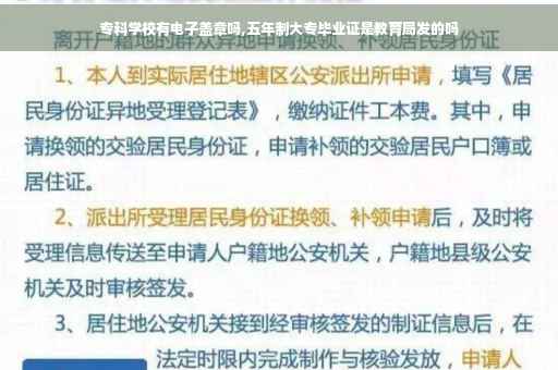 五年制大专毕业证是教育局发的。因为五年一贯制大专是我国普通全日制中等职业教育技术高中开办的非全日制大专班,招生初中毕业的学生,进校后需要参加成人高考然后在中专学校读五年书就可以毕业拿到非全日制大专毕业证书