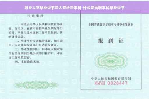 职业大学毕业证书是大专,职业本科一般是指高等职业本科,高等职业本科(简称高职本科)是全日制本科学历教育的一种,学位为专业学士,高职本科与普通本科共同构成中国高等教育体系的全日制本科层次。大专指的是专科,即专科教育,是高等教育的组成部分,是大学学历层次之一,专科教育的基本修业年限为二至三年,非全日制高等学历教育的修业年限应当适当延长。
