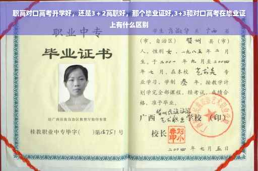 3+3和对口高考在毕业证上有全日制和非全日制区别。因为3+3是我国普通全日制中等职业教育技术高中与成人高考合作开办的非全日制大专,这种大专是非全日制学籍,含金量不高,毕业证会标明非全日制大专,对口高考是考全日制大专,毕业证会标明全日制大专