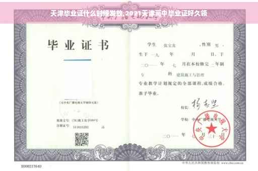 天津高中毕业证一般毕业当年的七月份即可发放,所以2021年的高中毕业证应该在七月份发了;高中毕业证需要学业水平考试测试合格才能取得高中毕业证书,如果考上大学并取得大学学位学历,,高中毕业证书意义就不算太,但没考上大学就特别有用。