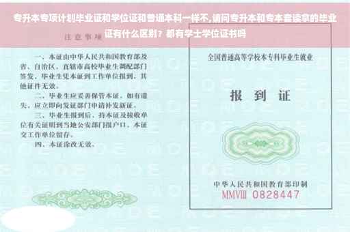 专升本专项计划毕业证和学位证与普通本科的毕业证和学位证在形式上基本相同,都是由学校颁发的证明学生已经完成学业并获得相应学位的证书。但是,专升本专项计划毕业生所获得的学士学位可能与普通本科毕业生所获得的学士学位有所不同,因为专升本专项计划是为了满足特定人群的需求而设立的,其课程设置和教学内容可能会有所调整。此外,专升本专项计划毕业生在就业方面可能会受到一些限制,具体情况需要根据不同地区和行业的规定来确定。