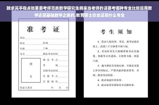 而研究生阶段的数学专业下各方向通常与中学阶段的教学内容相去甚远(除数论方向与中学的竞赛内容有些相关外),没猜错的话,您是想当中学(高,初中)老师吧,另外,研究生数学专业(各方向)考试科目数学分析150,高等代数和解析几何(有些学校解析几何不考)150,英语100,政治100,满分500。而学科教学(数学)却一般按教育学统考进行。另外,数学专业研究生阶段所学均是数学前沿研究性科研内容,学科教学才是教学实务性训练。希望可以帮到您。。。到此,以上就是小编对于教育硕士毕业证是什么专业的问题就介绍到这了,希望介绍关于教育硕士毕业证是什么专业的1点解答对大家有用。
