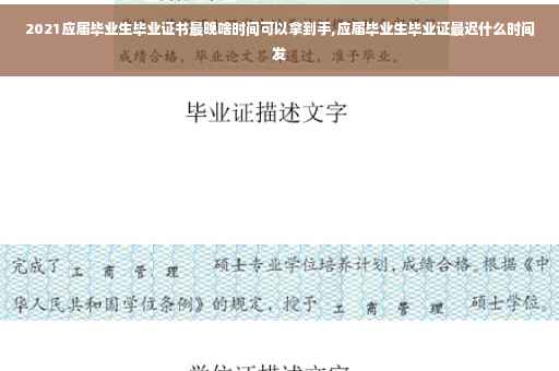 2021年应届毕业生的毕业证书一般是6月份到7月份之间发放到学生本人手中。众所周知,学生的毕业年限一般是四年,毕业时间一般安排在6月份左右,但是也有少部分学校因为自己特殊的时间安排而导致学生在7月份之后才能拿到毕业证和学位证,但并不会影响学生的就业。