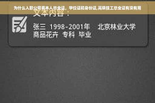 二、确定身份,确定本人和应聘资料对应。二、要建用工档案,以便后面社保、公安来查之用; 总之,没有身份证,不能办社保,也不能办劳动合同,也不能确认人员,企业要承担不必要的风险,而对于企业来说,任何的问题,都有可能带来风险,而身份证的出示,可以相对减少一些不必要的风险。要毕业证,学位证: 主要是证明你的求职资料上的毕业信息和学位信息是不是真的,确保招到的是合适专业人员。这样也杜绝了假信息的可能,求职资料和实际资料能相对应。企业真正招到了合适的人员,才能透露必要的企业信息,进行必要的上岗培训,减少不必要的浪费。高级技工毕业证在多个方面具有有用性: